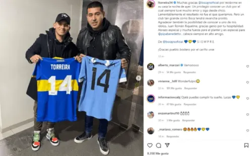 Torreira también tuvo la oportunidad de verse cara a cara con Juan Román Riquelme, quien le obsequió la camiseta del Xeneize para llevarse de recuerdo. “Agradecer también la posibilidad de conocer a uno de mis ídolos, Juan Román Riquelme, gracias genio por tu hospitalidad”, expresó el mediocampista a través de su perfil de Instagram.