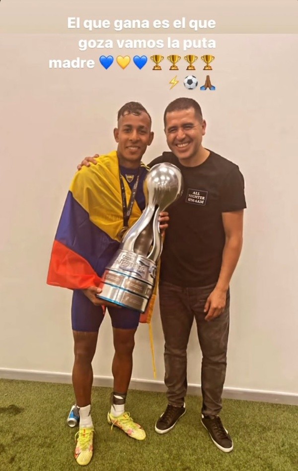 En el medio de todos los rumores por lo que pasará con él en 2022, el colombiano publicó una foto que sorprendió a todos. “El que gana es el que goza, vamos la puta madre”, escribió, y lo acompañó con una imagen suya levantando la Copa Argentina y acompañado por Juan Román Riquelme.