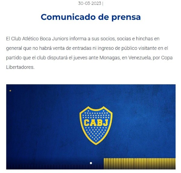 “El Club Atlético Boca Juniors informa a sus socios, socias e hinchas en general que no habrá venta de entradas ni ingreso de público visitante en el partido que el club disputará el jueves ante Monagas, en Venezuela, por Copa Libertadores”, comienza el artículo que fue publicado en la página web oficial de la institución pasadas las 9 de la mañana de este jueves.