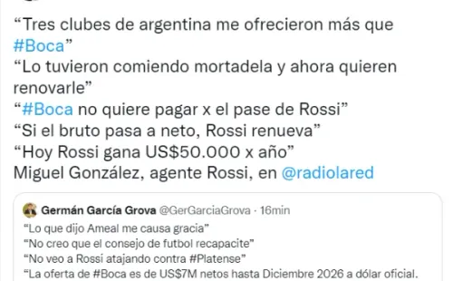 Instantes después, en el mismo medio radial, quien alzó la voz fue Miguel González, representante del arquero y figura del Xeneize. Las balas que recibió, las devolvió.“Le ofrezco a Boca hacer pública la negociación, a ver quien miente”, expresó el agente del jugador, muy caliente por el cruce de versiones por la oferta que el Xeneize le hizo a Rossi.