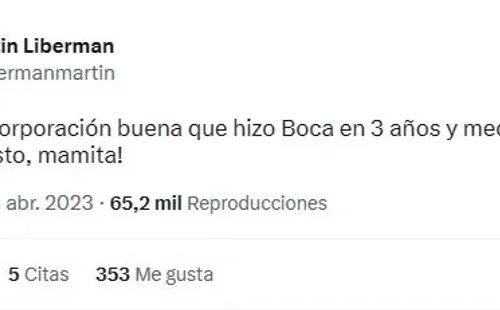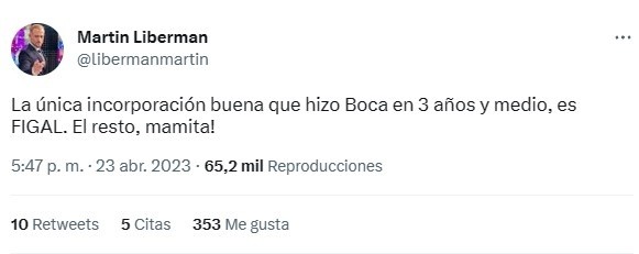 “La única incorporación buena que hizo Boca en 3 años y medio, es Figal”, posteó Liberman vía Twitter para luego pegarle a casi la totalidad del plantel:“El resto, mamita!”. Entre tantos reclamos al Consejo y a Román, llegó una “buena” por parte del conductor.