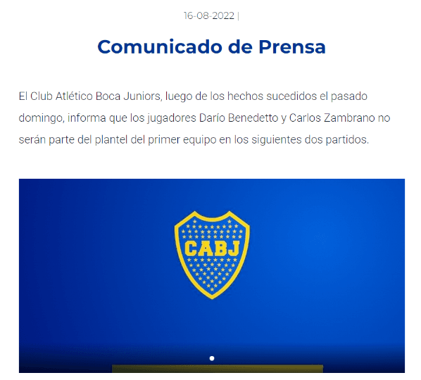 “El Club Atlético Boca Juniors, luego de los hechos sucedidos el pasado domingo, informa que los jugadores Darío Benedetto y Carlos Zambrano no serán parte del plantel del primer equipo en los siguientes dos partidos”, publicó el club de La Ribera a través de sus vías oficiales. Punto final a la historia.