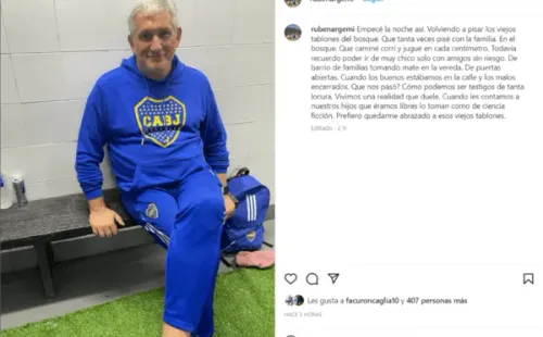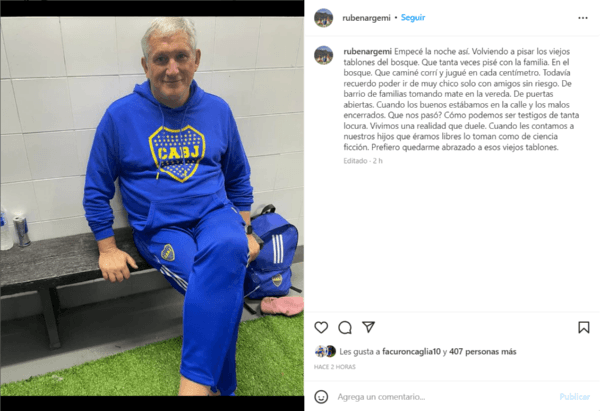 Compartiendo una imagen suya en el estadio un rato antes del partido, Argemi escribió en Instagram: “Empecé la noche así. Volviendo a pisar los viejos tablones del bosque. Que tanta veces pisé con la familia. En el bosque. Que caminé, corrí y jugué en cada centímetro”.