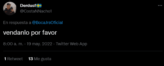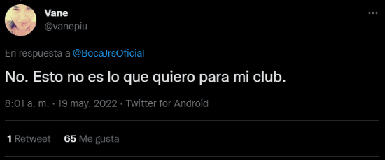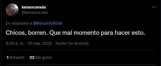 “No. Esto no es lo que quiero para mi club”, puso una simpatizante del club de la Ribera instantes después del tuit. Otro hincha contestó con un pedido: “Chicos, borren. Que mal momento para hacer esto”. En pocos minutos, el saludo se llenó de interacciones.