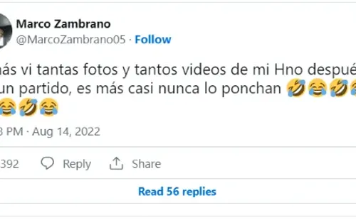 “Jamás vi tantas fotos y tantos videos de mi hermano después de un partido”, soltó Marco en su cuenta de Twitter y agregó: “Es más, casi nunca lo ponchan”. Una clara referencia a la cantidad de veces que fue enfocado por el golpe que tenía en su cara.}