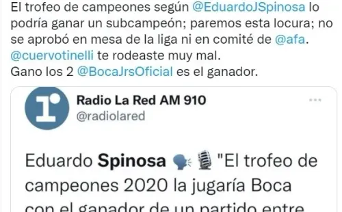 Sin embargo, el que apareció para desterrar esa versión es otro hombre fuerte de la Liga Profesional, el vicepresidente Cristian Malaspina, titular de Argentinos Juniors, quien en su cuenta de Twiter aseveró: “El trofeo de campeones según @EduardoJSpinosalo podría ganar un subcampeón; paremos esta locura; no se aprobó en mesa de la liga ni en comité de @afa. @cuervotinelli te rodeaste muy mal. Gano los 2 @BocaJrsOficial es el ganador”.