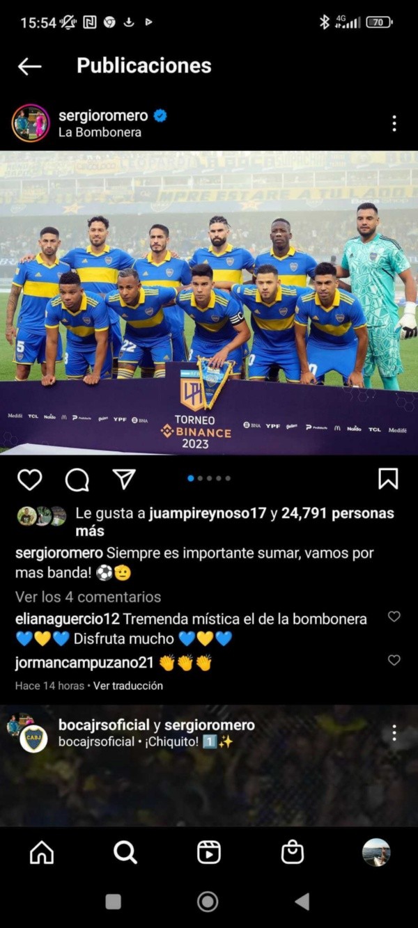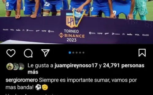 En redes sociales, el surgido en Racing realizó una publicación alusiva a su primera gran noche, donde de vuelta logró mantener el arco en cero. En la misma, su mujer Eliana Guercio hizo un comentario avalando la mística del estadio ubicado en Brandsen 805. Mirá: