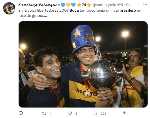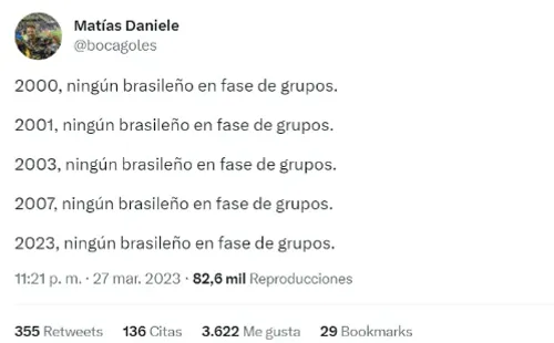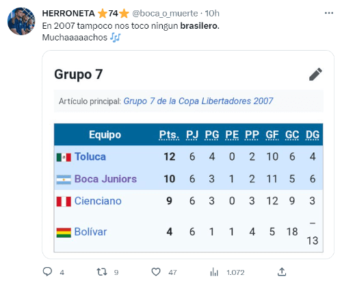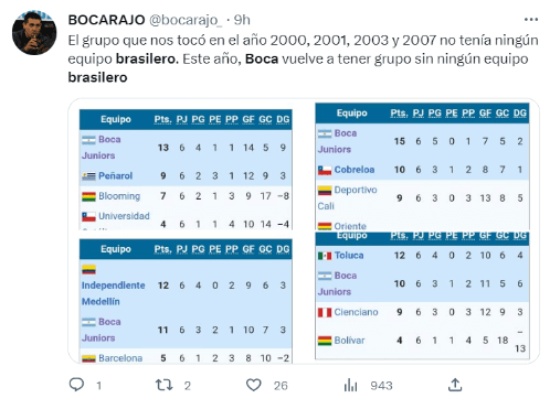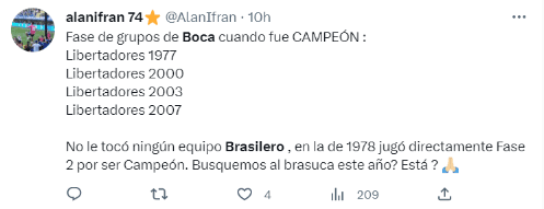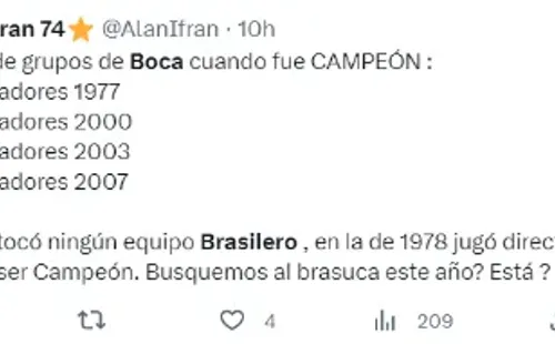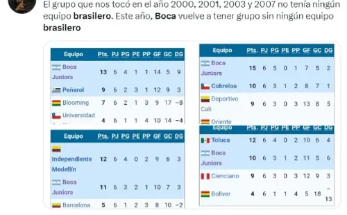 Boca ganó sus seis Libertadores en 1977, 1978, 2000, 2001, 2003 y 2007. Salvo en la del 78 (ingresó directo en semifinales por haber sido el último campeón), hay una coincidencia en todas esas ediciones con esta: no compartió grupo con ningún equipo de Brasil.