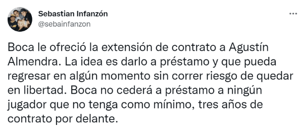 A pesar de que no tiene continuidad con Battaglia, los directivos quieren extenderle el contrato a Agustín Almendra. La idea es que adquiera rodaje en otra institución, ya que según la información que brindó el periodista partidario Sebastián Infanzón, “la idea es darlo a préstamo y que pueda regresar en algún momento sin correr riesgo de quedar en libertad”, además de que “Boca no cederá a préstamo a ningún jugador que no tenga, como mínimo, tres años de contrato por delante”.