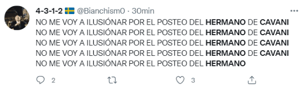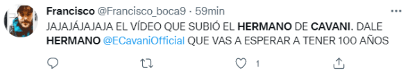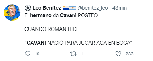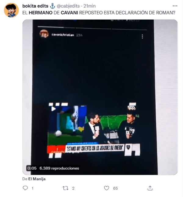 La cinta se trata de la declaración de Juan Román Riquelme que dio la vuelta al mundo, donde afirma que tanto Arturo Vidal como el propio Cavani “nacieron para jugar en Boca”. El fragmento fue reposteado por el pariente del delantero uruguayo, en una especie de nuevo guiño para la posible llegada del Matador al Xeneize.