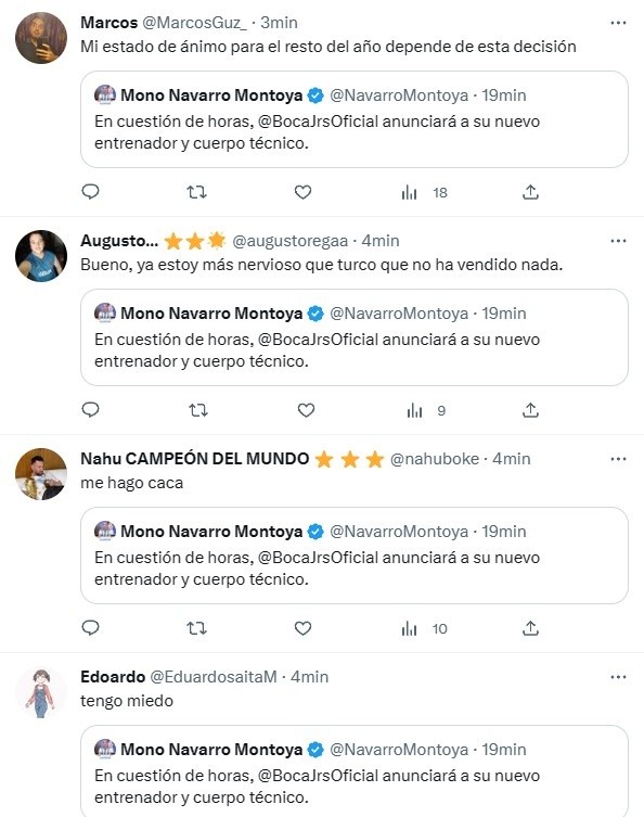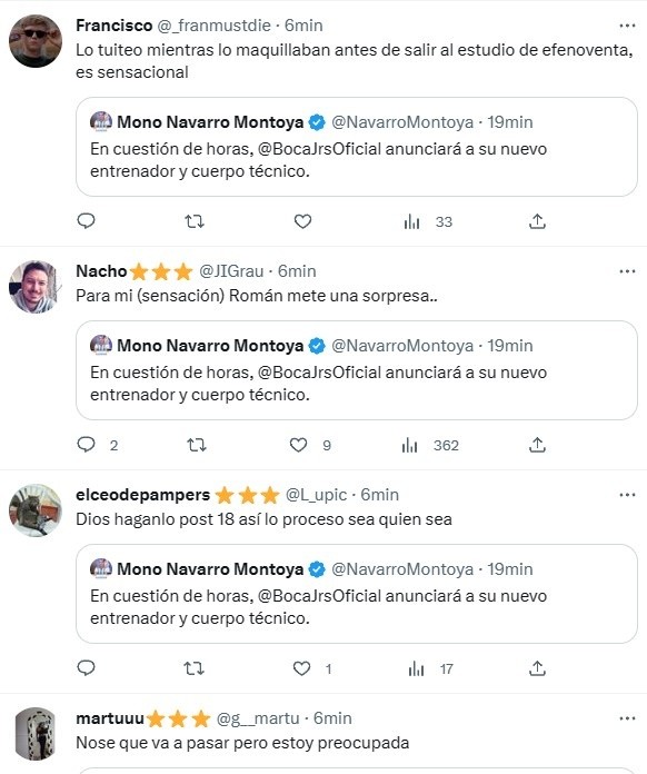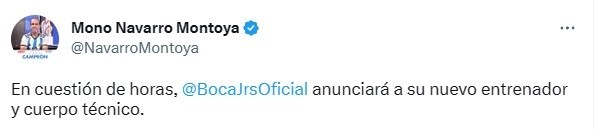 Fue en la tarde del miércoles, luego de que Riquelme no viajara con el plantel para el duelo contra Monagas, que CarlosNavarro Montoyalanzó un tuit que alteró a todos los hinchas del Xeneize. “En cuestión de horas, Boca anunciará a su nuevo entrenador y cuerpo técnico”, escribió el actual periodista de ESPN vía Twitter.