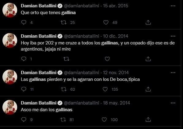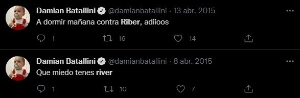 Mientras tanto, los hinchas palpitaron la posible llegada de Damián con tuits viejos del futbolista. Entre 2014 y 2015, Batallini escribió varios mensajes que denotan su fanatismo por Boca y su bronca hacia River. “Las gallinas pierden y se la agarran con los de Boca, típica”, “Asco me dan los gallinas” y “Hoy iba por 202 y me crucé a todos los gallinas, y un copado dijo ‘Ese es de Argentinos’, jajaja ni miré”, fueron las publicaciones que se encontraron.