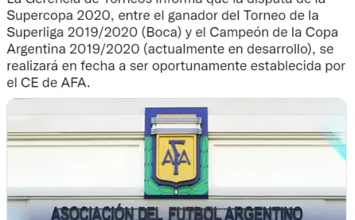 “La Gerencia de Torneos informa que la disputa de la Supercopa 2020, entre el ganador del Torneo de la Superliga 2019/2020 (Boca) y el Campeón de la Copa Argentina 2019/2020 (actualmente en desarrollo), se realizará en fecha a ser oportunamente establecida por el CE de AFA”, publicó la casa madre del fútbol argentino en febrero de 2021, meses antes de que Boca obtuviera el título federal.