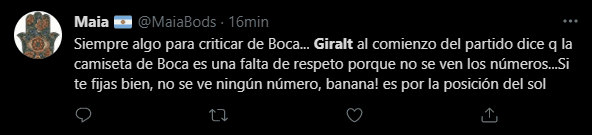 Ante el color total de la camiseta, de color gris claro, y con el pleno sol de la tarde cordobesa, los números en la espalda de los jugadores de Boca apenas se ven en la cámara de la transmisión oficial, cosa que hizo enojar mucho al relator de TNT Sports, Pablo Giralt.