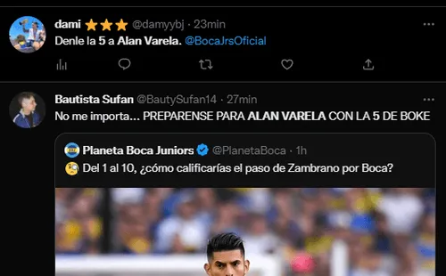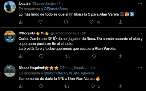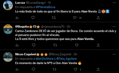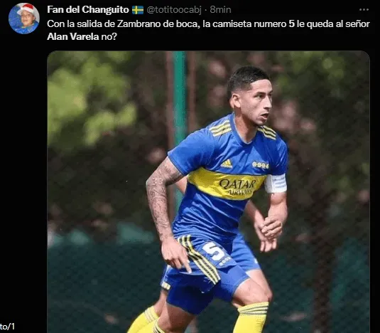 En concreto, en Twitter fue tendencia el nombre de Alan Varela porque se inició la militancia para que el talentoso volante central xeneize utilice la camiseta número “5” que deja vacante Zambrano con su salida. Actualmente, el oriundo de Isidro Casanova usa la 33 desde su debut y los hinchas se mostraron a favor de que se cambie el dorsal al que supieron utilizar futbolistas como Mauricio Serna, Sebastián Battaglia y Fernando Gago entre tantos otros y que él mismo usó en Reserva.