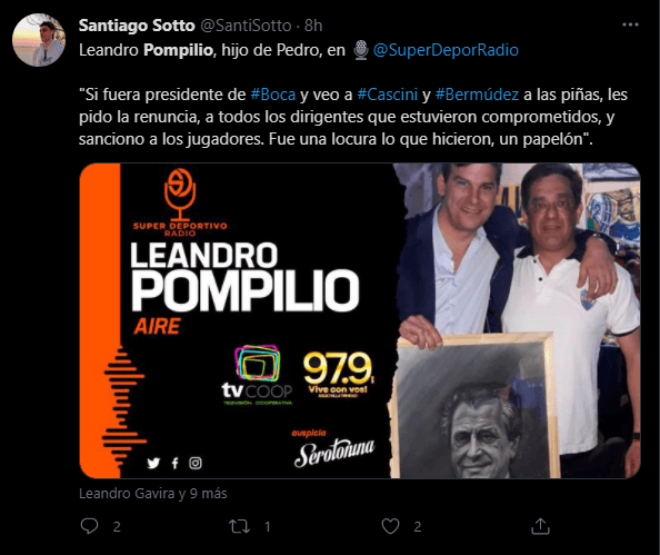 El hijo de Pompilio, quien fue parte de la oposición en las elecciones, dialogó conSuper Deportivo Radio emitido por Radio Villa Trinidad, donde dijo sobre los hechos ocurridos: “Si hoy fuera presidente de Boca y veo a Cascini y Bermúdez a las piñas y a todos los dirigentes que estuvieron comprometidos, les pido la renuncia y también sanciono a los jugadores“.
