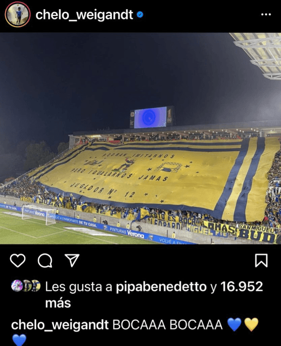 El Pipa se despachó con un like a una foto que subió Marcelo Weigandt, que no fue de la partida en La Plata (sigue recuperándose de una lesión) pero estuvo presente en la cancha. La imagen de la hinchada de Boca contó con la aprobación de Benedetto. Se reencontrarán pronto.