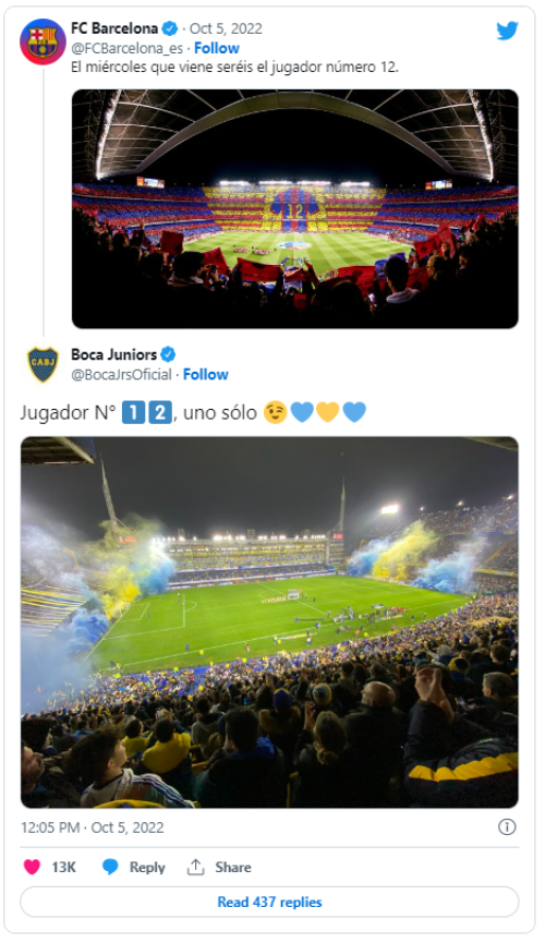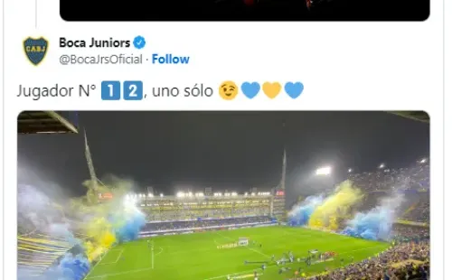 Palpitando dicho cruce, el Barca tuiteó: “El miércoles que viene seréis el jugador número 12”. La cuenta oficial del club de la Ribera, bien atenta, respondió: “Jugador número 12 hay uno solo”. Además, lo acompañó con una imagen de La Bombonera.
