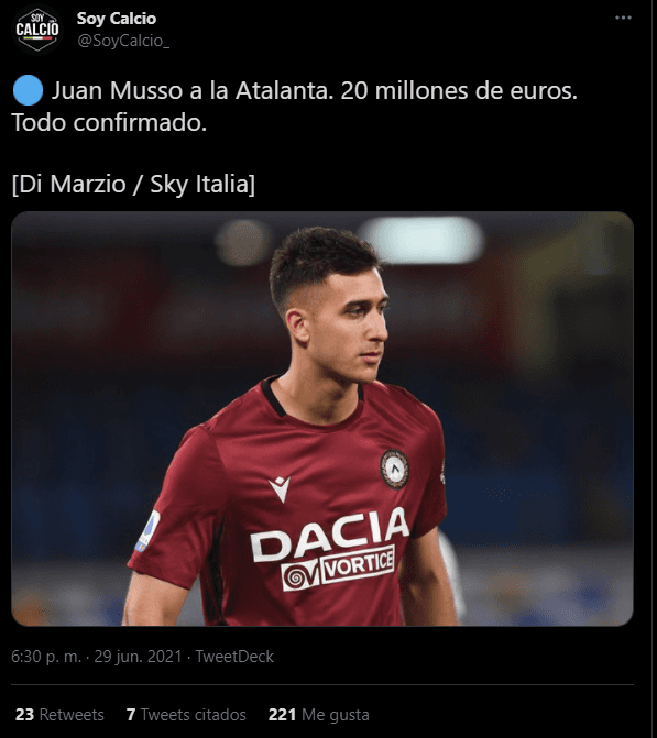 Antes del arranque de la Copa América, en el Udinese habían tres jugadores convocados por Scaloni. Ahora queda solo uno. Primero Rodrigo De Paul fue traspasado al Atlético de Madrid del Cholo Simeone y ahora se confirmó la baja de Juan Musso, quien seguirá su carrera en el Atalanta a cambio de 20 millones de euros.