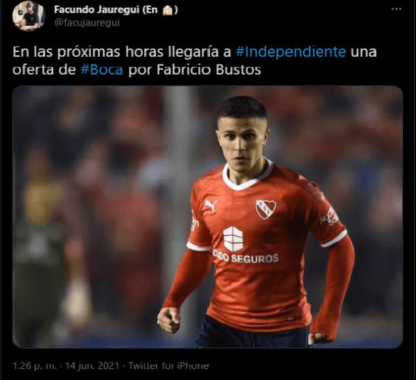 La información la trascendió Diego Monroig en Sportscenter, quien también afirmó que es una situación por ahora lejana ya que desde el entorno de Boca y el de Luis Advícula, se dice que por más que su equipo ascienda a la LaLiga, el defensor peruano llegará al club, por lo que lo de Bustos es más un plan B. Desde Independiente no verían con malos ojos una negociación por él ya que a partir del próximo mercado puede negociar como jugador libre e irse sin dejarle ganacia al club de Avellaneda.