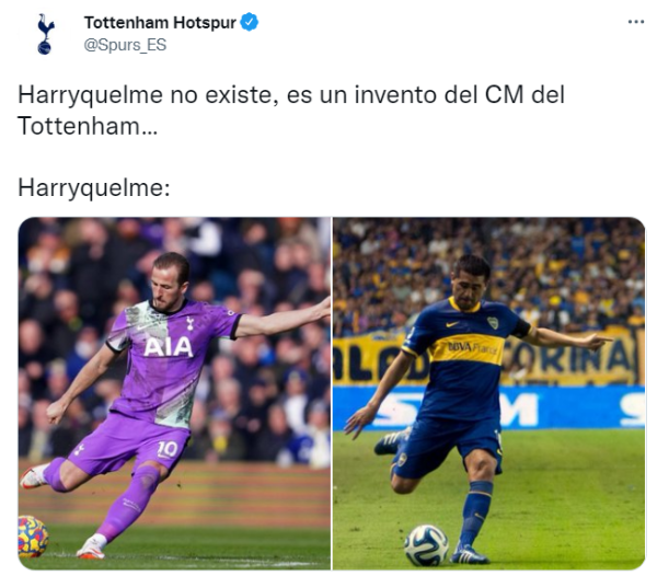 La cuenta en español de los Spurs en Twitter le creó un nuevo apodo a su estrella, combinando su nombre y el del actual vicepresidente de Boca. “Harryquelme”, publicó el Tottenham en su vía oficial, lo cual generó una ola de interacciones con los hinchas del Xeneize; el posteo alcanzó los 37 mil likes. A continuación, la cuenta de Boca respondió al pie de la imagen con el famoso “¿Y si te llama Román?”y generó un boom total por el diálogo entre ambas instituciones por la red del “pajarito azul”.