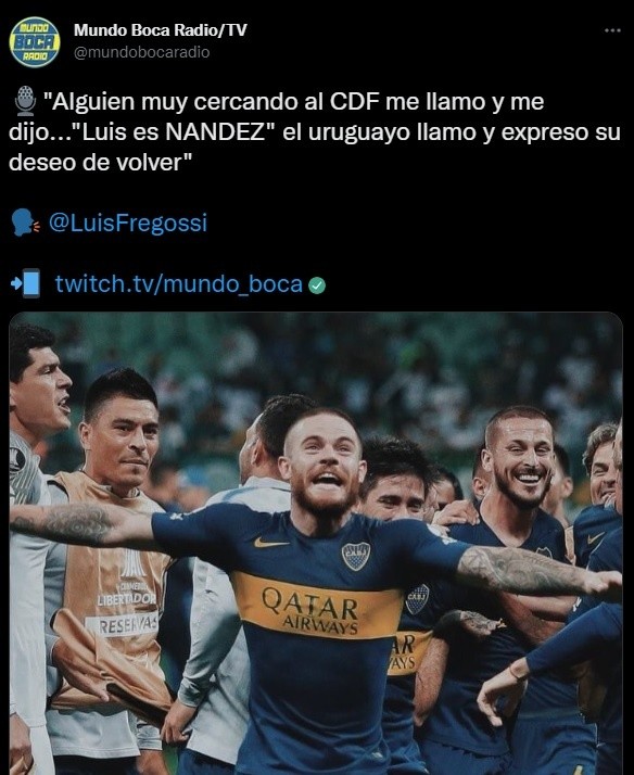 El periodista partidario Luis Fregossi reveló en “Mundo Boca Radio” que Nahitan Nández manifestó su deseo de regresar al conjunto azul y oro después de tres años. “Alguien muy cercano al consejo de fútbol me llamó y me dijo: ‘Luis, es Nández’. El uruguayo llamó y expresó su deseo de volver”, manifestó.