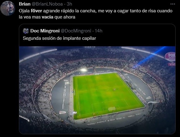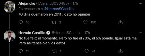 “No importa la capacidad si no la podes llenar. Datos no opinión”, fue otro de los comentarios que recibió el periodista. “Porque la llena muy de vez en cuando, ¿no? Por favor”, ironizó Castillo. Una nueva jornada de debate y chicanas en Twitter de la que Castillo no quiso quedarse afuera.