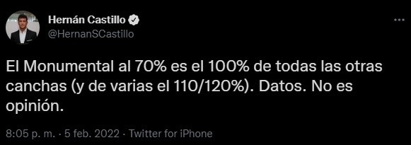 “El Monumental al 70% es el 100% de todas las otras canchas (y de varias el 110/120%). Datos. No es opinión”, manifestó el conductor en su cuenta de Twitter. La primera respuesta que recibió fue: “7 % la quemaron en 2011, dato no opinión”. “No fue feliz el momento. Pero no fue el 70%, el 5% ponele. Igual está mal. Pero asi tenés bien los datos”, replicó Hernán.
