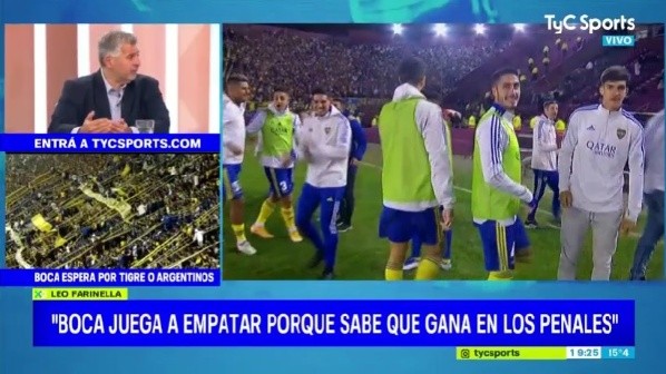 Farinella atacó con todo a Boca: “No conozco antecedentes de victorias que sean fracasos. Boca fracasa todo el tiempo, aún ganando por penales. No pateó al arco”. “¿A vos te parece que en una semifinal contra Racing Boca sea un equipo que no patee al arco con los jugadores que tienen? Me llama la atención. Felicitaciones a Boca, es finalista en buena ley, pero Racing jugó el partido como debía jugarse”, disparó.