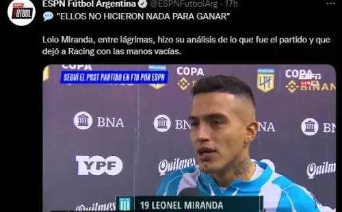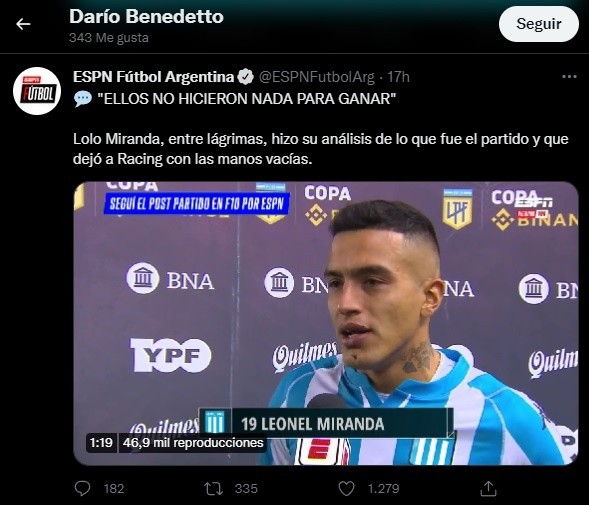 “Yo creo que tiene muy poco para reprocharse Racing. Le faltó suerte o precisión, lucidez en los últimos metros. Pero Racing en los últimos años tenía muy buenos equipos criticados por defraudar en partidos decisivos y traicionar sus convicciones”, dijo el panelista en TyC Sports. Y agregó: “Hoy verdaderamente jugó el partido como un equipo grande y fue el único de los dos que lo hizo”.