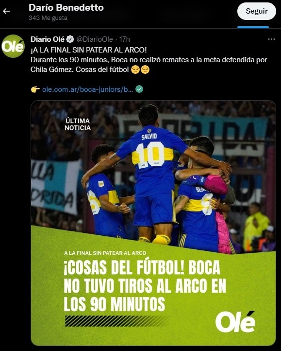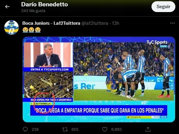 Los hinchas en las redes sociales se burlaron de las declaraciones del periodista y un referente de Boca mostró su postura con un “like”. Darío Benedetto dio tres “me gusta” en Twitter tras el partido: uno a un tuit que se burlaba de Farinella, otro a la declaración de Lolo Miranda contra el juego de Boca y uno más al dato de que el Xeneize no pateó al arco. El “Pipa” lo disfrutó a su manera.