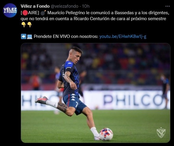 Se trata de Ricardo Centurión, quien atraviesa sus últimos días en Vélez Sarsfield. Según informó el medio partidario “Vélez a Fondo”, Mauricio Pellegrino le comunicó a los dirigentes que no lo tendrá en cuenta para el 2022.