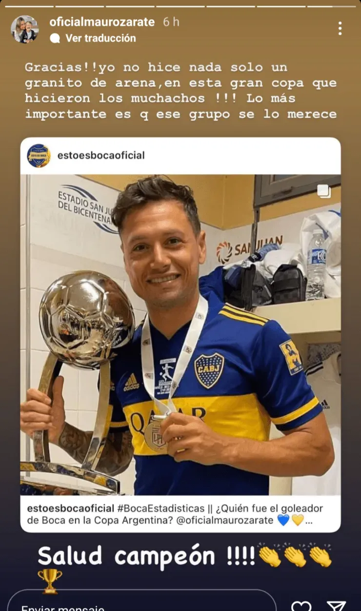 Con poca participación en el 11 y apenas un puñado de partidos, a Mauro Zárate le alcanzó para ser goleador del último título que ganó el equipo dirigido por Sebastián Battaglia. A lo lejos, el hoy jugador del América Mineiro de Brasil aprovechó para mandar un saludo por las redes.