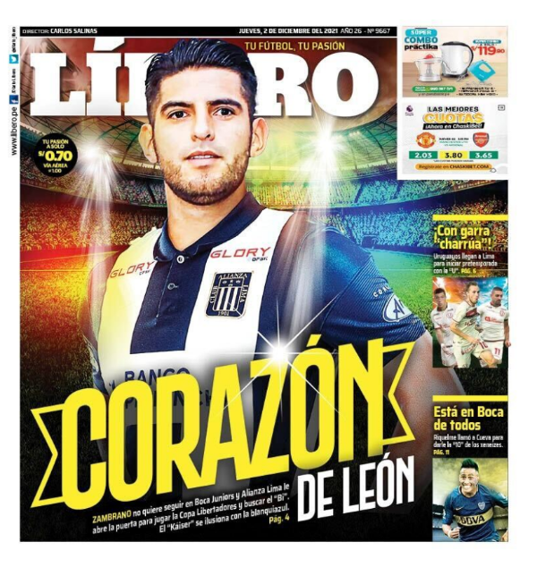 “Zambrano no quiere seguir en Boca y Alianza Lima le abre la puerta para jugar la Copa Libertadores y buscar el ‘Bi’. El ‘Kaiser’ se ilusiona con la blanquiazul”, escribió el medio peruano en la edición de este jueves 2 de diciembre. En la tapa, el jugador del Xeneize aparece como principal protagonista junto a una edición que ya lo ubica con la camiseta de Alianza Lima. En caso de darse, sería su primera experiencia en el fútbol de su tierra natal.