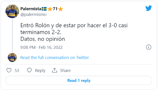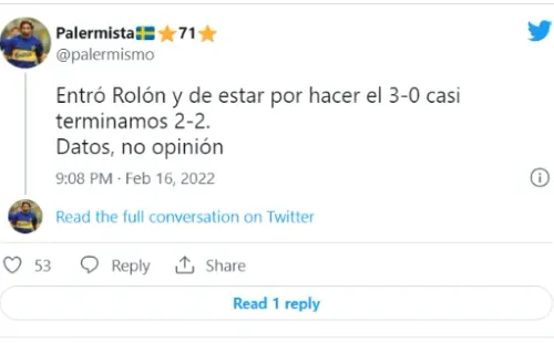 La variante que no gustó fue la última: el ingreso de Esteban Rolón por Diego Gonzále. Algunos le adjudican responsabilidad al volante por el gol de Cauteruccio, mientras que otros reclaman minutos para Alan Varela en su lugar.