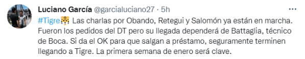 Según amplióLuciano García, periodista cercano a Tigre, el conjunto asentado en Victoria ya inició conversaciones para hacerse de los servicios de Agustín Obando mediante la figura del préstamo; solo restaría el pulgar arriba del DT del Xeneize para que la operación se concrete. El volante tuvo un ascenso maratónico dentro de la Primera de Boca y Miguel Ángel Russo le dio más minutos que a -casi- ningún juvenil con la camiseta azul y oro. Sin embargo, Battaglia no se mostró convencido con su juego y decidió bajarlo a la Reserva, justo antes de que una rotura de tendón en su pie derecho lo dejara tres meses afuera tras la cirugía.