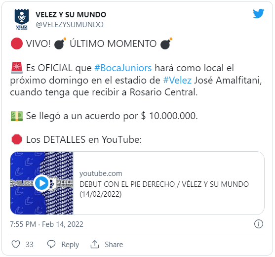 Todo este asunto no le sale barato a Boca. Según reveló ‘Vélez y su Mundo’, alrededor de 10 millones de pesos saldrán del bolsillo xeneize para alquilarle la cancha al Fortín. Esto será solamente para el próximo partido, lo que significa que habrá que negociar nuevamente en el caso de necesitarla para el siguiente encuentro de local.