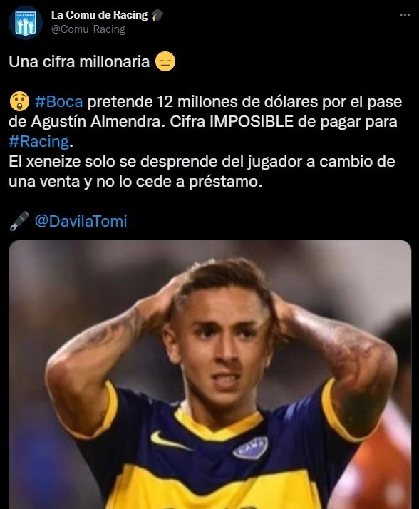 El periodista Tomás Davila contó cuál es la cifra que quieren desde el Xeneize para poder dejar ir a Almendra. “Boca pretende 12 millones de dólares por el pase de Agustín Almendra. Cifra IMPOSIBLE de pagar para Racing. El xeneize solo se desprende del jugador a cambio de una venta y no lo cede a préstamo”, señaló el medio partidario Comu Racing. Complicado para el club de Avellaneda.