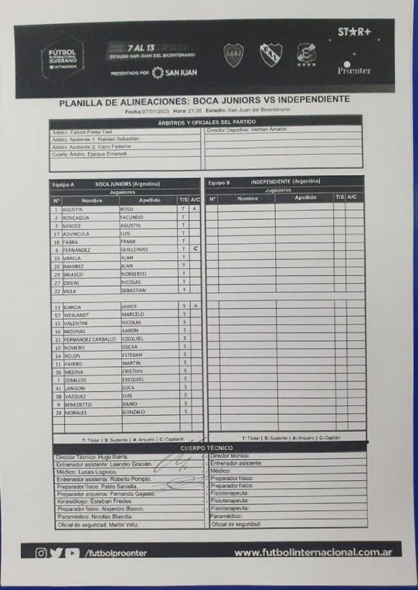 Después de que se confirmara que Varela dejará de lado el dorsal 33 y comenzará a utilizar el mítico 5, que alguna vez fue portado por Mauricio Serna, como así también por Fernando Gago, en la planilla oficial del partido lo anotaron con su antiguo número. Pero lo llamativo es que al momento de hacer el precalentamiento, el nacido en Isidro Casanova salió al campo de juego con su nuevo dorsal.