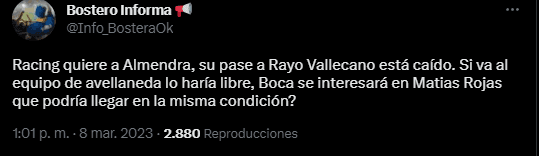 Con chances de firmar su contrato como agente libre en junio en Racing, desde Boca estarían pretendiendo un inédito trueque con los de Avellaneda con un futbolista que se encuentra en la misma situación que Almendra: Matías Rojas. El volante/extremo paraguayo termina contrato en junio con Racing y aún no hubo indicios por renovar, y por eso ya circuló el rumor de que Boca lo buscaría para que arribe con el pase en su poder a mitad de año.