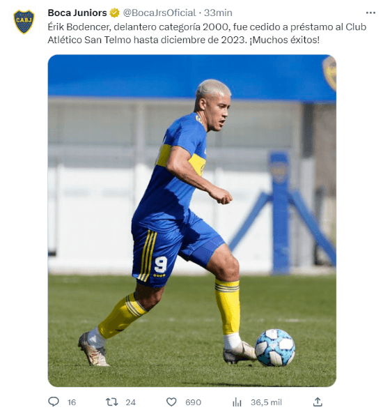“Érik Bodencer, delantero categoría 2000, fue cedido a préstamo al Club Atlético San Telmo hasta diciembre de 2023”, comunicó en club en sus redes oficiales. El atacante viene de jugar la última temporada en Sacachispas y ahora vestirá los colores del candombero.