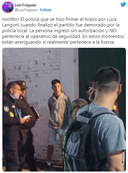 Sin embargo, lo que era una historia curiosa se convirtió en un desenlace bochornoso. Según informó el periodista Luis Fregossi, la persona que ingresó al terreno de juego para pedir la firma de Langoni no era parte del operativo de seguridad y hasta se está investigando si realmente era policía. Una maniobra más que particular para conseguir un autógrafo.