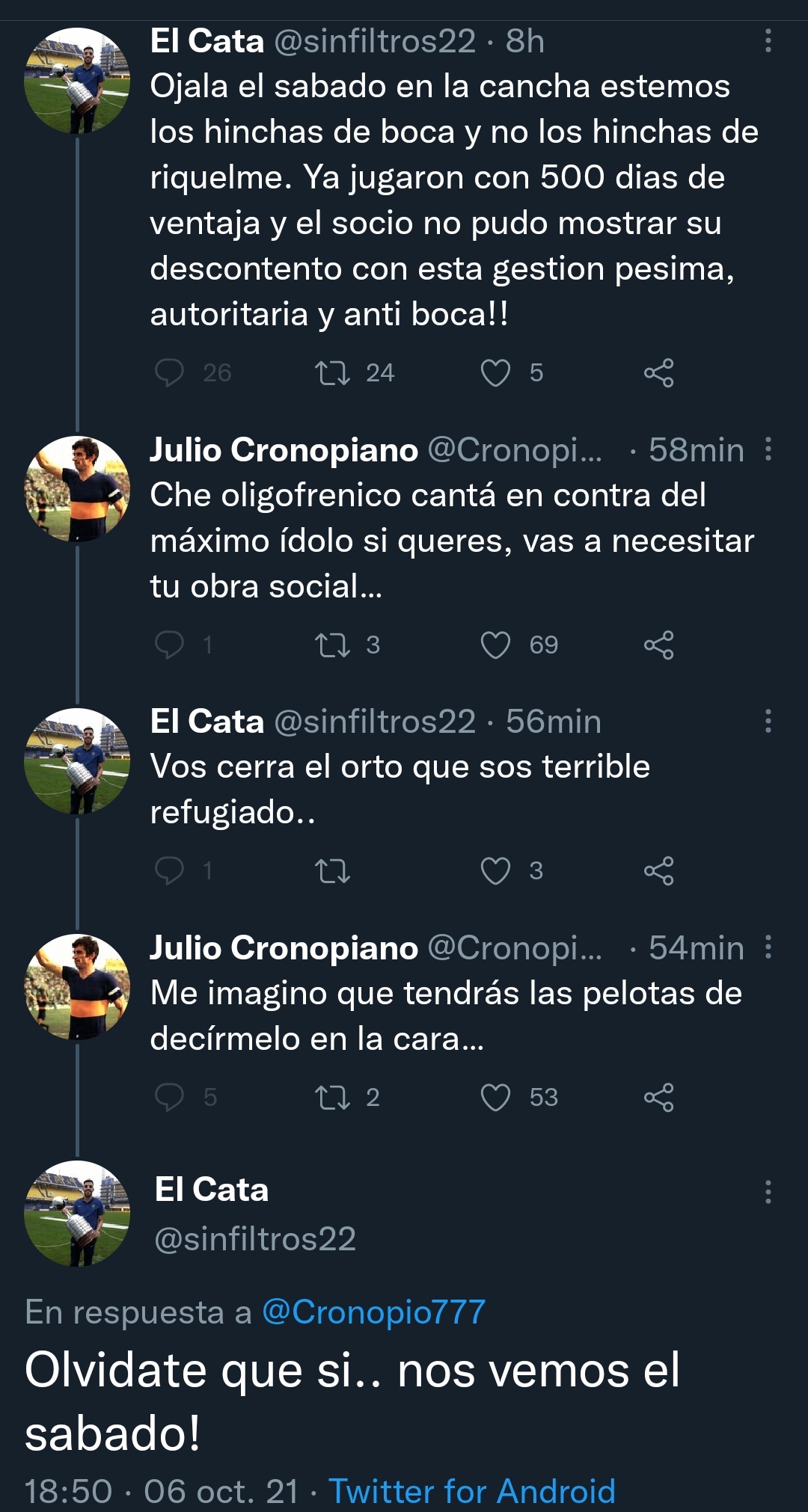 En eso, irrumpió con una respuesta otro twittero, Julio Cronopiano, quien es un firme militante del oficialismo de Boca. Y luego de una conversación subida de tono, acordaron encontrarse en las cercanías de La Bombonera para una pelea.