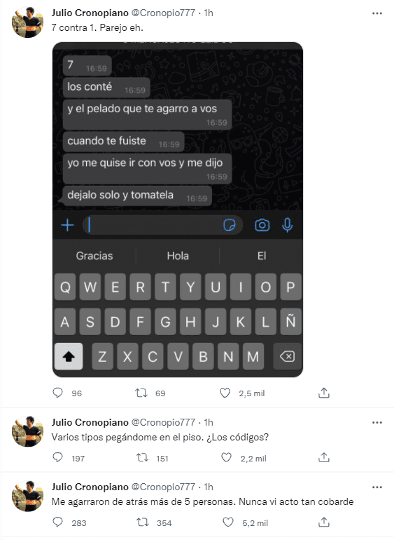 Obviamente, en las redes comenzaron a palpitar el duelo, pero finalmente no llegó de esa forma. Según el propio Cronopiano relató, lo cruzaron entre 7 conocidos de @sinfiltros22 y le pegaron de espaldas, dejando al twittero con la cara totalmente destruida. Papelón.
