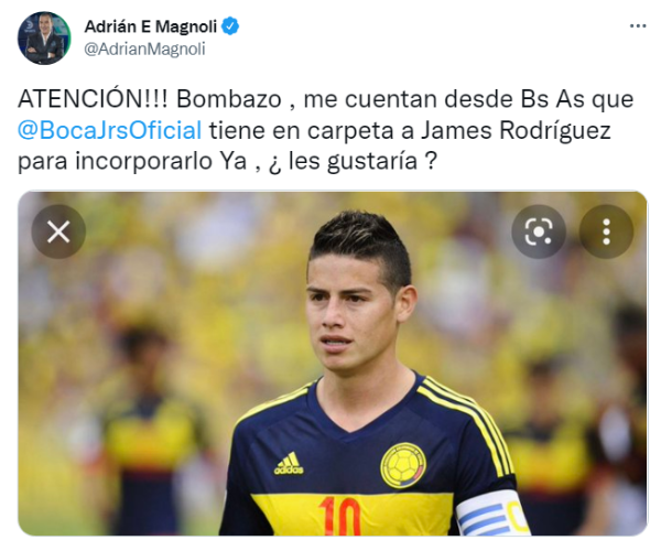 Es que el tuit que publicó el periodista de DIRECTV Sports, Adrián Magnoli, superó cualquier tipo de escala en la imaginación del fanático del Xeneize. “¡Atención! Bombazo: me cuentan desde Buenos Aires que Boca Juniors tiene en carpeta a James Rodríguez para incorporarlo ya”, expresó el jornalista a través de su cuenta de Twitter para dar a conocer la noticia.
