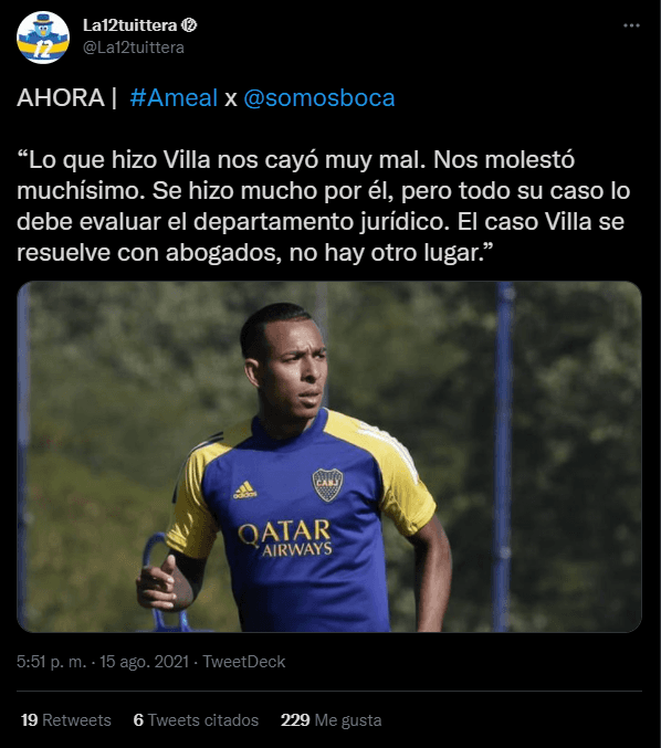 Sobre este tema, habló el Presidente de Boca, Jorge Ameal. En la previa del partido que luego resultó en derrota para el Xeneize ante Estudiantes, Ameal dialogó con la radio partidaria “Somos Boca”, donde dijo: “Lo que hizo Villa nos cayó muy mal. Nos molestó muchísimo. Se hizo mucho por él, pero todo su caso lo debe evaluar el departamento jurídico“.