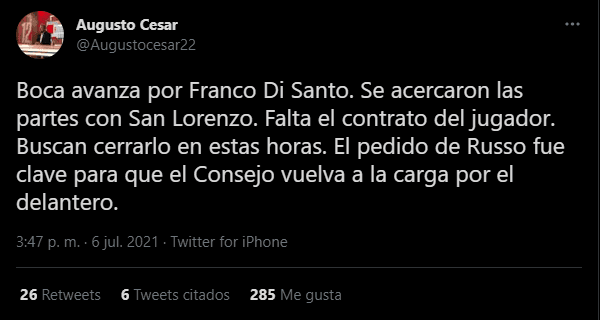 A exactamente una semana de los octavos de finalde la Copa Libertadores, donde Boca se cruzará ante Atlético Mineiro, el mercado de pases le saca una sonrisa a Juan Román Riquelme y a Miguel Ángel Russo, quienes querrán cerrar a Di Santolo antes posible para que entrene a la par de sus compañeros y pueda ser una opción viable para el duelo copero.