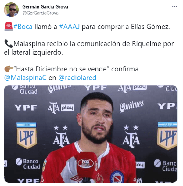 Durante las últimas horas, el Presidente de Argentinos Juniors, Cristian Malaspina reveló que Riquelme llamó por teléfonopara comprar a Elías Gómez, el 3 del Bicho. Sin embargo, la respuesta no fue la mejor.“Me llamó (Román) para preguntar condiciones por Elías Gómez, pero no creo que se vaya ahora. Si lo vendemos será en diciembre”, sentencióla autoridad del club La Paternalen Radio La Red.
