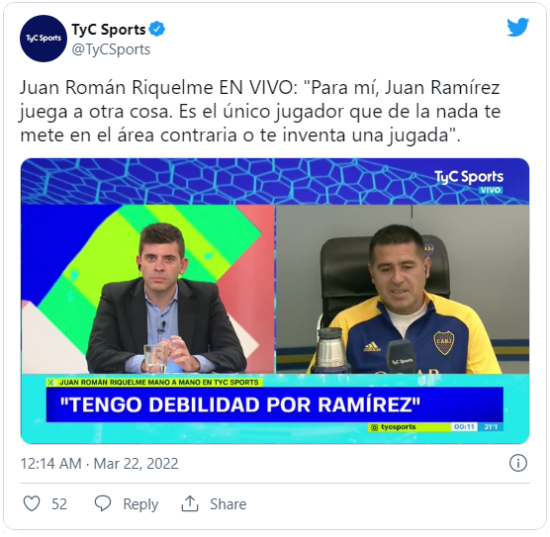 Como era de esperarse, los más ponderados por el ídolo fueron las figuras como Agustín Rossi, Pol Fernández y Sebastián Villa. Román tampoco dejó pasar la oportunidad para tirarle flores a Darío Benedetto y hasta a Franco Armani. Luego, llegó el turno de elogiar a un futbolista muy perfil bajo.