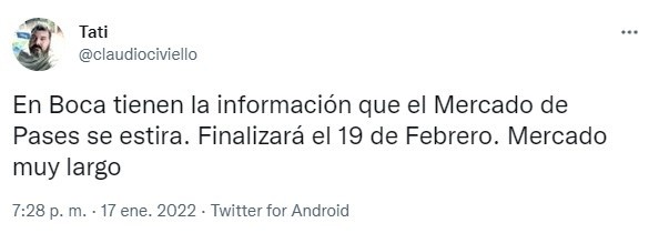Así lo contó el periodista Claudio Civiello: “En Boca tienen la información de que el mercado de pases se estira. Finalizará el 19 de febrero. Mercado muy largo”. De esta manera, queda un mes más para asegurar la llegada de otros refuerzos.
